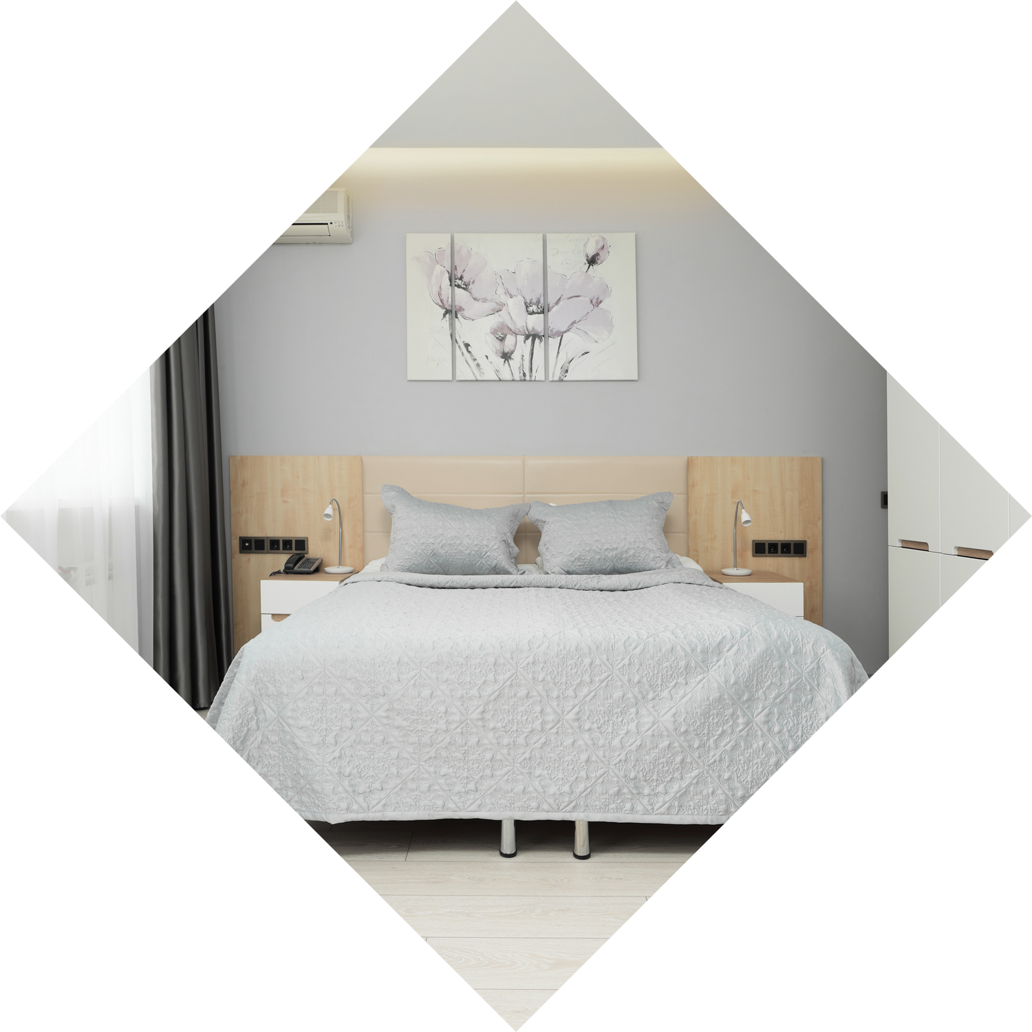 • Спальня на двоих: большая 2-х местная кровать, гардероб, столик с зеркалом, детская кроватка